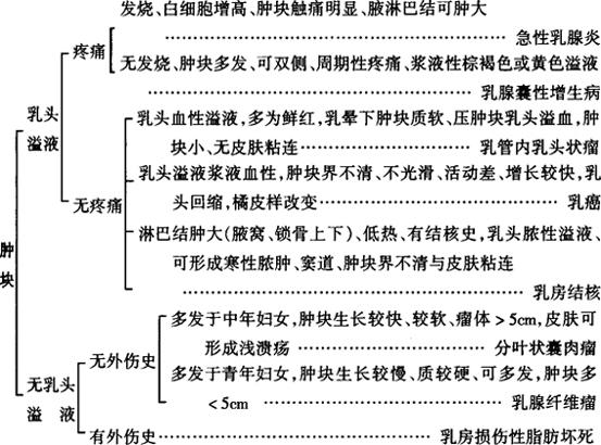 | 释义 | 乳房肿块 【病因及诊断思路】 乳房炎症、损伤、增生性疾病及肿瘤等均可形成乳房肿块。乳房肿块临床上最为常见。乳房肿块的鉴别诊断主要靠询病史、体格检查及必要的辅助检查,诊断并不困难。抓住肿块及肿块伴发症状才能形成正确的诊断思路。乳房肿块的诊断思路如下: