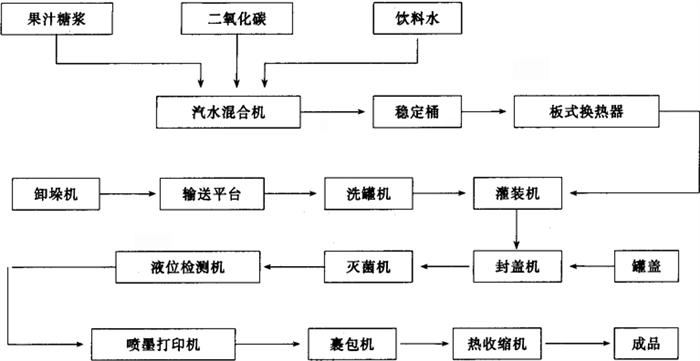 图2-2-11 二片罐灌装啤酒工艺流程 主要技术参数: 整线生产能力:100罐/min,300罐/min; 适用容器:铝质易开盖两片罐(GB9106-88); 灌装容量:355mL; 整线总功率:57kW,90kW; 整线占地面积:约300m2,600m2。 2.2 二片罐灌装果汁类含气饮料工艺流程(图2-2-12)