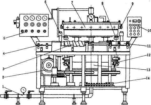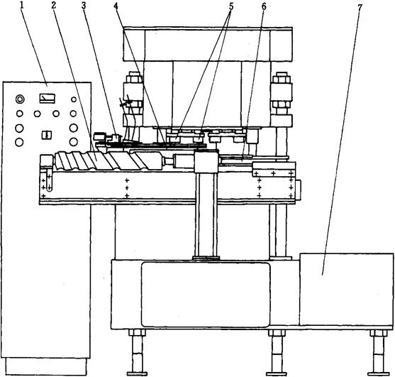 图2-2-13 GDG20B灌装机结构图 1-进料管 2-主电机 3-不等距螺杆 4-输入带 5-气控箱 6-环形导轨 7-料缸 8-灌装阀 9-拨叉 10-电气操纵台 11-输出带 12-托罐升降气缸 13-转台 14-润滑装置 3.1.3 主要技术参数 生产能力: 100罐/min,120罐/min 灌装阀数量: 20 灌装进料压力: 0.2MPa 气源压力: 0.6MPa 背压气体: 净化空气 工作台面高度: 1150mm 电源: 3相,380V,50Hz 主电机功率: 2.2kW 机器外形尺寸: 1820mm×1944mm×1927mm(长×宽×高) 机器重量: 3575kg 罐规格: 二片罐 三片罐 罐容量 355mL 250~320mL 罐径 66mm 52.8~66mm 罐高 (122±0.3)mm (91±0.3)~(133±0.3)mm 液料温度 2~8℃(含气) <50℃(不含气) 3.2 FBG4封盖机 3.2.1 应用范围 适用于二片罐实罐与易开盖的密封封罐,也适用于三片罐实罐与易开盖的密封封罐或三片罐实罐与底盖的密封封罐。 3.2.2 基本原理和主要结构(图2-2-14) 本机采用实罐体旋转时卷边滚轮对罐体中心作径向移动,完成二重卷边达到实罐体与易开盖的密封封罐。实罐体由输送带送入,通过不等距螺杆分罐后经拨轮送到转台的托罐座中央。在拨轮上的送盖装置,当有实罐体进入拨轮,就有一只罐盖落在罐体上,无罐体则不落盖。当托罐座带实罐体一起回转时,凸轮使托罐座上升,使压帽把易开盖与实罐体压紧,带动二片罐绕本身的中心线旋转。此时卷边滚轮向罐盖靠紧,使罐体与罐盖上的翻边钩合,形成卷边过程。然后二道滚轮向罐盖靠紧,使罐体与罐盖更紧密钩合,完成卷边封盖。当转台再回转时,凸轮使托罐座下降,同时在压帽中心的顶杆在凸轮推动下,使二片罐与压帽脱开。再由输出拨轮将二片罐从托罐座上拨入输送带。