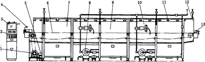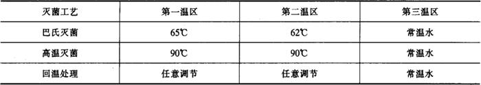 图2-2-15 SRL16A灭菌机外型图 1-主电机 2-电气箱 3-气控箱 4-吹干风帘 5-冷却水泵 6-输罐链板 7-第三温区 8-列管式加热器 9-第二温区 10-第-温区 11-喷淋头 12-防雾水帘 13-输罐带 3.3.3 主要技术参数 饮料类别: 啤酒,果汁类饮料 适用容器: 二片罐、三片罐、聚酯瓶、玻璃瓶 容器高度: <300mm 生产能力: 送罐线速度有三种(表2-2-3) 喷淋水温度: 第一、第二温区≤90℃,任意设定(表2-2-4) 输入蒸汽压力: 0.25~0.5MPa 控制阀后端压力: 0.15MPa 蒸汽消耗量: 147.35万kJ/h 水消耗量: 约4m3/h,0.2MPa 压缩空气消耗量: 约2.5m3/h,0.3MPa 电源: 3~380V,50Hz 总功率: 20kW 机器外形尺寸: 7600mm×2400mm×1690mm(长×宽×高) 机器重量: 5916kg 表2-2-3