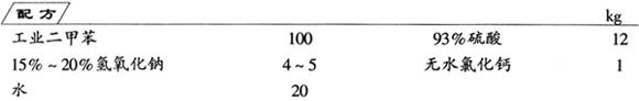 制法 (1)酸洗 将100kg甲苯原料放入耐酸缸中,不断搅拌,慢慢加入12kg浓度93%以上的工业硫酸。连续搅拌3h左右,使二甲苯与硫酸充分混合,作用完全。然后,让其静置半小时左右,分层后取上层清液(即二甲苯)15ml,进行中间控制分析,观察硫酸试验是否合格。如不合格时,则应继续搅拌至合格为止。如原料中杂质过多,可把下层的硫酸放出,再加12kg浓度93%以上工业硫酸,搅拌至硫酸试验合格为止。 (2)水洗、碱洗 在上述所得的二甲苯中加入20kg洁净自来水,充分洗涤,搅拌半小时左右,然后让其静置分层,取水层测其硫化合物含量,如不合格,将水层放掉,然后加入4~5kg15%~20%的氢氧化钠溶液,搅拌半小时后停止,静置半小时后将下面水层放掉,再测酸碱度。如不合格再按上述方法再行水洗、碱洗,至合格为止。 (3)干燥 将上述经过酸洗、水洗、碱洗合格的二甲苯放入干燥洁净的白铁桶中(占桶的体积4/5左右),然后加入无水氯化钙1kg左右,将桶盖盖好,放倒并滚动2min(每隔4h滚动2min),24h后将桶立起桶口向上,取出桶内的二甲苯做水分检验。如不合格时,可再加入适量的氯化钙,至水分合格为止。 (4)蒸馏 将干燥合格的二甲苯置于蒸馏器内(投料量不超过容积的2/3为宜),进行减压蒸馏。馏出物经色谱分析,收集合格馏分即为产品。 二甲苯分子式为C6H4(CH3)2,相对分子质量为106.17。本试剂为无色透明液体,较易着火,相对密度0.86,着火点29℃,不溶于水,能溶于乙醇、氯仿、乙醚及其他多种有机溶剂。毒性与苯及甲苯相似,其蒸气吸入人体内易中毒,与皮肤接触易造成皮炎等症。二甲苯是多种有机合成工业的重要原料,并广泛用作溶剂和试剂。 |
