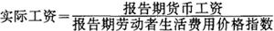 “名义工资”的对称。指工资货币额在一定时期内能够实际购买到的生活资料和服务(包括房租、公用事业的服务、理发、洗澡等等)的数量。实际工资是反映劳动者实际生活水平的一个重要标志。在名义工资不变的情况下,实际工资水平取决于消费品价格(或劳务费)、房租、捐税等因素。一般讲,如果消费品价格或各种服务费用等上涨的幅度大于职工名义工资增长的幅度,就会引起劳动者实际工资的下降,实际工资的计算公式如下: