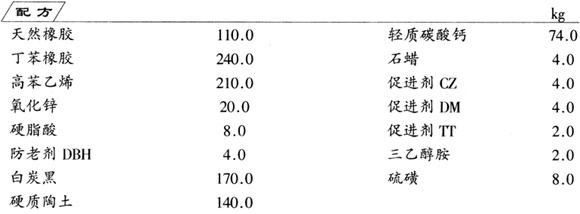 制法 (1)塑炼 在开放式炼胶机上,对高苯乙烯进行塑炼。塑炼条件为:辊温65~70℃,辊距0.5mm,薄通二次,以光滑无粒状为宜,下片冷却待用。 在开放式炼胶机上,同样对天然橡胶和丁苯橡胶进行塑炼。先塑炼天然橡胶,炼均匀后加入丁苯橡胶,混合均匀,使其可塑度达到0.30~0.35,下片待用。 (2)掺合 在开放式炼胶机上,将已经塑炼好的天然橡胶、丁苯橡胶混合胶投入机辊,使其包辊均匀,然后加入已塑炼好的高苯乙烯。控制辊温为65~70℃,辊距为3.0~4.0mm,使高苯乙烯与橡胶在机辊上混合均匀,以光滑无粒为准。然后将辊距调节为0.5~0.8mm,薄通5次,下片待用。 (3)混炼 将已经掺合好的高苯乙烯与天然、丁苯胶的混合胶投入到开放式炼胶机上,使其包辊至光滑均匀。炼胶机的辊距为3.0~4.0mm,辊温为65~70℃。加入配合量的各种添加剂进行混炼。添加剂的加入顺序为: 混合胶包辊→氧化锌、防老剂DBH→1/2的补强填充剂(白炭黑、陶土、碳酸钙)→三乙醇胺→1/2的补强填充剂→硬脂酸、石蜡→促进剂(CZ、DM、TT)→硫磺 各种添加剂都混入胶料后,薄通5次,下片,冷却待用。 (4)平板硫化 在400mm×400mm双层框式油压蒸汽平板机上,对上述混炼胶进行硫化。工艺条件为:油压9×106Pa,蒸汽压力4×105Pa,时间20min。 硫化后的产品,停放4h以上,即为成品,可用于制作牛皮鞋底。 |