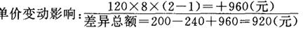 由于计算的基础不同,所以因产量变动影响的结果发生了差异。但是我们同时也看到,因素排列的顺序不同,只能导致各因素的影响程度不同,并不造成各因素影响总额的变化。在两种替换顺序的情况下,各因素影响的费用总额都是920元。因此,在使用连环替换法时,要想合理地分析出各因素的影响程度,必须按照它们之间的依存关系和内在的规律性正确地按排顺序。一般情况下,主要指标在先,次要指标在后,数量指标在先,质量指标在后;实物指标在先,价值指标在后。各因素的排列顺序一经确定后,不能轻易变动,否则就会影响可比性,不能求得正确的分析结果。 (2)差异计算法。这种方法也是用于因素分析的,它是用同一影响因素实际数与计划数的差额,直接计算该因素对经济指标的影响程度,实际上是连环替代法的简化形式。它们的原理完全相同,只是方法简便易行。现在仍以上面举的资料为例,进行说明。 计划指标体系:100×10×1=1000(元) 产量变动影响:(120-100)×10×1=+200(元) 单耗变动影响:120×(8-10)×1=-240(元)