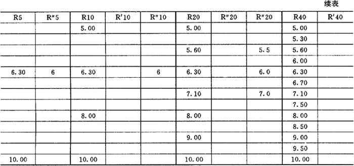 注:1.本表选自ISO497-1975。化整值系列栏内未列出的项值,R′系列取常用值,R″系列取R′系列中的项值。 2.R40系列在特殊情况下(例如不允许分档间距“倒缩”时),允许以1.15作为1.18的化整值,以1.20作为1.25的化整值,构成系列1,1.05,1.10,1.15,1.20,1.30,…。 2.变形系列 从基本系列和补充系列中,按照一定规则选取某项值,得到派生和复合两种系列称为变形系列。 (1)派生系列 从Rr系列中,按一定的项差(序号差)p取值,构成派生系列,简号Rr/p。例如,R10的派生系列和R5的移位系列:
