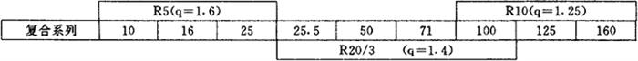 公比与某基本系列相等,但起点项或任一项不属于该基本系列的派生系列,称为移位系列。如上表中R10/2(1.25…)是R5(1...)的移位系列。 (2)复合系列 复合系列是指由若干个公比不同系列混合构成的多公比系列。例如: