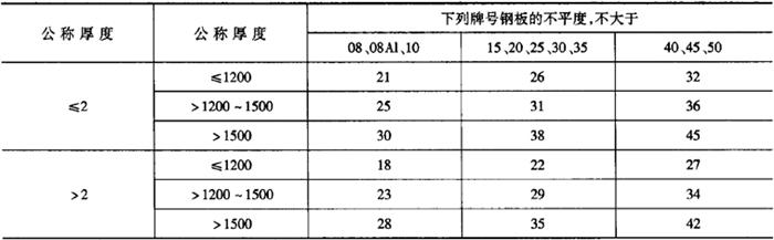2.尺寸、外形及允许偏差 钢板的不平度应符合表5-60的规定,其他尺寸、外形及允许偏差应符合GB/T709的规定,45、50牌号的钢板和钢带厚度允许偏差可增加10%。 表5-60 钢板的不平度mm
