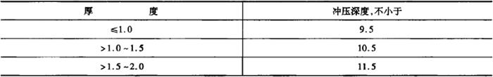 (4)特殊要求 1)杯突试验 用08、08A1钢轧制厚度不大于2mm的钢板和钢带可进行杯突试验,每个测量点的杯突值应符合表5-63的规定。 表5-63 杯突试验mm