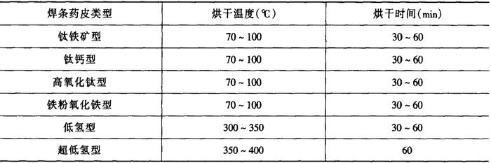注:括号内的焊条牌号,表示可以代用。 焊条要严格按照焊条烘干说明书进行烘干和使用,防止产生气孔和氢致裂纹。烘干温度必须适中,常用焊条的烘干温度及时间见表2-2-19。 表2-2-19 焊条烘干温度及时间[3]