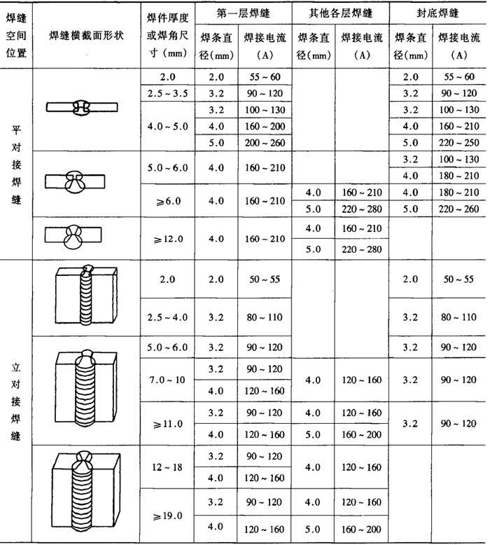 (3)焊接工艺参数 手工电弧焊主要的焊接工艺参数是焊接电流,应在保证焊接质量的基础上,尽量采用大电流。一般情况下可根据板厚,选用合适直径的焊条和层数,然后根据焊条直径选择焊接电流,焊条直径与焊接电流的关系见表2-2-22。表2-2-23为不同空间位置采用的典型坡口形式及其焊接工艺参数。 表2-2-22 焊条直径与焊接电流的关系[4]