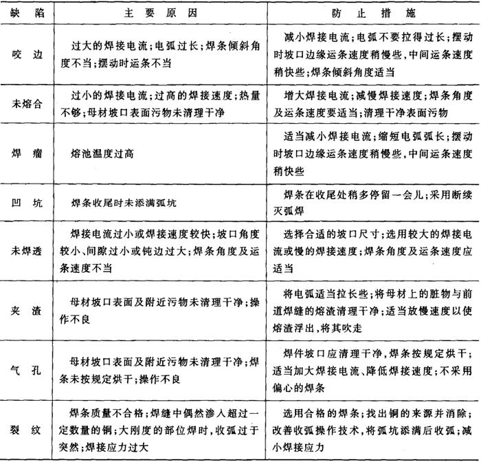(5)常见焊接缺陷及防止措施 若操作技术不良或焊条、焊接工艺参数选择不当,可能出现各种缺陷,表2-2-25为常见的缺陷、产生的主要原因及防止措施。 表2-2-25 低碳钢手工电弧焊常见缺陷产生的主要原因及防止措施[5]