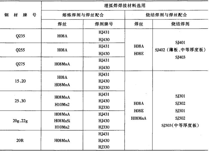 注:碱性焊条不宜采用灭弧焊,以免产生气孔。 (6)焊接工艺要点[4]: ①为了防止空气侵入焊接区域而引起焊缝金属产生裂纹或气孔,应尽量采用短弧焊。 ②热影响区在高温停留时间不宜过长,以免晶粒粗大。 ③多层焊时应连续焊完最后一层焊缝,每层焊缝金属的厚度不大于5mm。 ④焊接角焊缝时,对接多层焊的第一道焊缝和单层单面焊缝尽量避免采用深而窄的坡口形式。 ⑤低温条件下焊接容器类产品时,应考虑采用碱性焊条,并对焊件进行预热。 ⑥当焊接刚性大的构件时宜采取焊前预热和焊后消除应力的处理措施。 2.埋弧焊 埋弧焊生产效率比较高,所获得的焊缝光滑、美观,具有良好的综合力学性能。它可以焊接板厚在3~150mm之间的低碳钢,接头形式可以是对接接头、丁字接头、搭接接头、十字接头,尤其适用于焊缝比较规则的构件。 (1)焊接材料的选择 埋弧焊焊接材料包括焊丝和焊剂,两者必须合理配合使用才能获得良好的焊接接头。焊接低碳钢时,为了保证良好的焊缝综合性能,并不要求其化学成分必须与母材完全相同,通常要求焊缝金属的含碳量较低些,并含有适量的锰、硅等元素,以达到焊接接头所需的性能。 一般选用实芯焊丝H08A或H08E与高锰高硅低氟熔炼焊剂相配合,这种配合能够保证足够数量的Mn和Si过渡到熔池,从而保证焊缝良好脱氧和合格力学性能。另外,也可选用中锰、低锰或无锰的焊剂与含锰较高的焊丝(如H08MnA、H08Mn2等)相配合。近年来,烧结焊剂应用越来越广泛,可以采用SJ301、SJ401等与H08A配合焊接低碳钢,以获得优良的焊缝。表2-2-26是低碳钢埋弧焊用的焊接材料。 表2-2-26 低碳钢埋弧焊用的焊接材料[6]