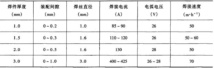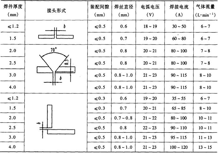 注:横焊、立焊、仰焊的电弧电压取表中下限值。 表2-2-42 细丝二氧化碳气体保护焊焊接工艺参数[4]