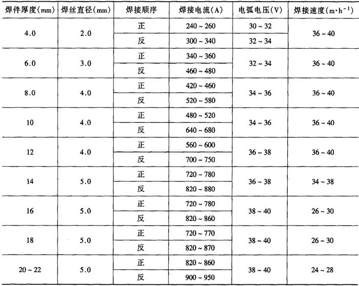 注:HJ431、焊丝直径5mm。 表2-2-32 低碳钢开坡口双面埋弧焊焊接工艺参数[3,4]