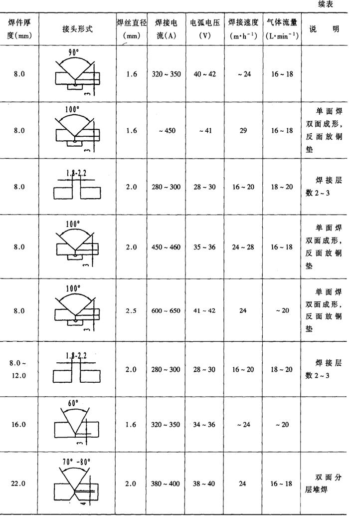 注:焊接方向一栏中1表示从上向下,2表示从下向上。 表2-2-49 碳钢的双焊丝大电流MIG焊的典型焊接工艺参数[7]