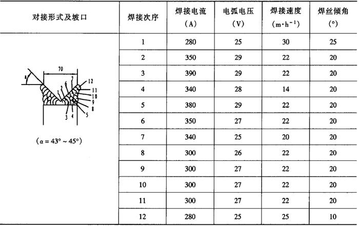 注:正面焊缝在焊剂垫上焊接。 表2-2-33 低碳钢厚板深坡口埋弧焊焊接工艺参数[4]