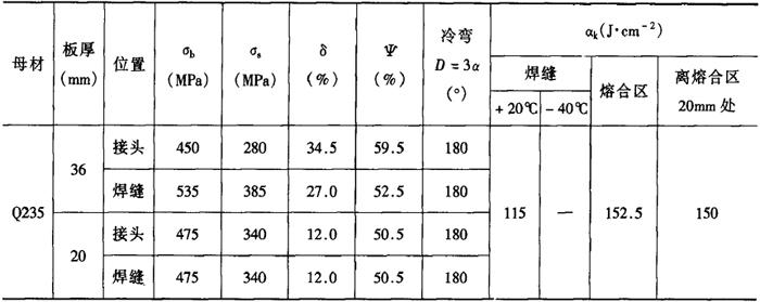 注:①焊接电流100~110A,电弧电压20~21V,CO2气流量为500L/h。 ②母材尺寸为14mm×100mm×500mm。 表2-2-51 采用H08Mn2SiA焊丝焊Q235的焊缝及接头的力学性能[3]