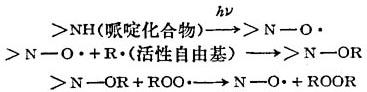 这类光稳定剂对聚烯烃有突出的稳定效果,多用于薄膜和纤维。它们在溶剂中的溶解性极小,用于纤维时耐洗性优良,并兼有助染剂之功能。但镍络合物具有绿色,有使制品着色的不足,又因它们大都含有硫原子,高温加工时有变色倾向,因此不适用于透明制品。这类光稳定剂多与二苯甲酮类、苯并三唑类等紫外线吸收剂并用,有良好的协同效应。 4.自由基捕获剂 这类光稳定剂自七十年代初期由日本三共公司首创以来,受到普遍的重视。从化学结构上看,它们可视为是有空间阻碍的哌啶衍生物,故亦可称为受阻哌啶或简称受阻胺。 受阻胺类光稳定剂特别适用于聚烯烃、聚苯乙烯、聚氨酯等塑料,其稳定效能比紫外线吸收剂高数倍。关于它们的作用机理目前尚未确定,据一般推测,可能是通过多种方式发挥作用,其中捕获自由基是一主要功能,将其归类为自由基捕获剂也正是出自此理由。这一功能可直观地理解为是光稳定化的第四道防线,即一旦聚合物吸收了紫外光并分解产生出导致自动氧化反应的活性自由基后,为了阻止链式氧化反应蔓延下去,捕获剂将活性自由基抓获,使其成为稳定的分子化合物。在这一过程中,受阻胺是以稳定的氮氧自由基形式发挥作用: