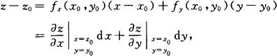 | 释义 | 全微分 全增量 如果函数z=f(x,y)在点P(x,y)的某邻域内有定义,并设P′(x+△x,y+△y)为这邻域内的任意一点,则称这两点的函数值之差 f(x+△x,y+△y)-f(x,y) 为函数在点P对应于自变量增量△x,△y的全增量,记为△z,即 △z=f(x+△x,y+△y)-f(x,y). 全微分 如果函数z=f(x,y)在点(x,y)的全增量 △z=f(x+△x,y+△y)-f(x,y) 可以表示为 △z=A△x+B△y+o(ρ), 其中A,B不依赖于△x,△y而仅与x,y有关, A△x+B△y 称为函数z=f(x,y)在点(x,y)的全微分,记为dz,即 dz=A△x+B△y, 其中 习惯上,记全微分为
