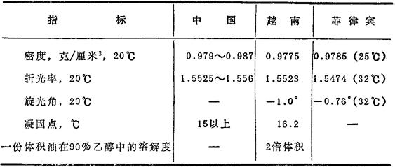 苏联用从越南进口原料生产的八角茴香油性质如下: 密度,克/厘米3,20°/20℃ 0.9750~0.9791 折光率,20℃ 1.552~1.554 凝固点,℃ 15~17 茴香脑含量,% 94~98 法国标准中(1),规定精馏的八角茴香油质量指标如下: 密度,克/厘米3,20°/20℃ 0.979~0.987 折光率,20℃ 1.5525~1.5560 凝固点,℃,不低于 15 根据ГОCT 3173-68规定,八角茴香油的质量指标应与茴香油质量指标相同(见10页)。 根据各国药典资料,八角茴香油的性质见表4.2。 表4.2 根据各国药典资料八角茴香油的物理化学指标