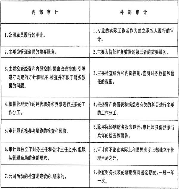 从内部审计和外部审计的内容来看,检查弊端和测试内部控制制度都是共同的目标。它们的区别列表如下:
