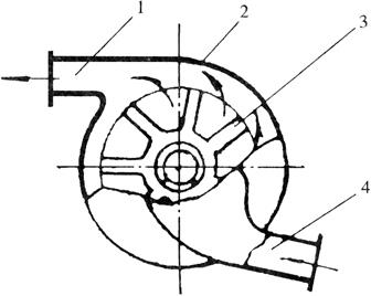 图1-52 强制循环式水冷却系 1.风扇 2.散热器 3.散热器盖 4.溢水管 5.水温表 6.节温器 7.水泵 8.水套 9.配水管 10.放水栓 11.旁通管 如果水温达到正常温度(85℃)时,节温器主阀全开,旁通阀全闭,冷却水即进行大循环。如果水温在70~85℃之间,主阀门和旁通部分开启,因此一部分冷却水进行大循环,也有一部分冷却水只作小循环。 强制循环冷却系的主要部件: 1.水泵和风扇 水泵和风扇的构造如图1-53所示。水泵工作原理如图1-54所示。风扇皮带通过皮带轮和水泵轴带动水泵叶轮旋转,冷却水在离心力的作用下沿叶轮的叶片甩出,叶轮的外缘水压增大并经与叶轮成切线方向的出水管被压入水套;同时,由于叶轮中部的水被甩向边缘,压力降低,所以冷却水由散热器下水管和水泵的进水管流入水泵。只要叶轮不停地旋转,水泵就不断地将冷却水吸入和压出,系统内冷却水就会不断地循环。
