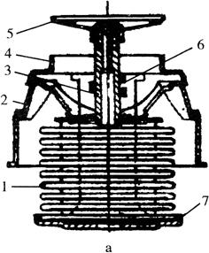 图1-56 乙醚式节温器 a.大循环 b.小循环 1.皱纹筒 2.旁通阀 3.推杆 4.壳体 5.主阀门 6.导向板 7.底座 8.旁通孔蜡式节温器的构造如图1-57所示。感应器体与感应器罩构成一个密封空间,内装有胶管,胶管中心插有导杆。胶管与感应器体之间装有熔点低的石蜡和白蜡混合物。当水温低于70℃时,通往散热器的阀门在弹簧的作用下与阀座接触,处于关闭状态,冷却水只能进行小循环。水温超过70℃时,石蜡混合物开始熔化,体积膨胀,使胶管受压变形,导管下部锥面对胶管压力的垂直分力克服弹簧弹力,使感应器体向下移动,打开阀门,有部分冷却水经阀门流入散热器;仍有部分冷却水进行小循环。当水温达到正常工作温度85℃时,阀门全开,则大部分冷却水进行大循环。