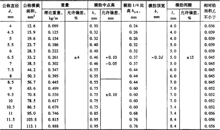 式中 Σfi——钢筋周圈上各排横肋间隙之和; h——横肋中点高; h1/4——横肋长度四分之一处高。 (3)尺寸、重量及允许偏差 三面肋和二面肋钢筋的尺寸、重量及允许偏差见表5-29。 表5-29 三面肋和二面肋钢筋的尺寸、重量及允许偏差
