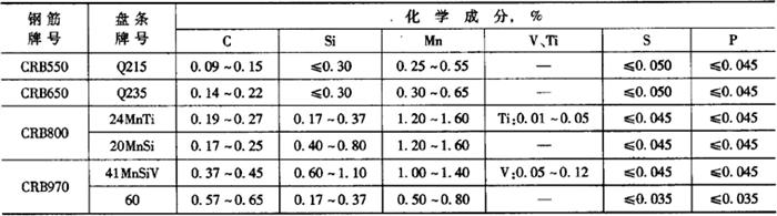 注:1.横肋 2.二面肋钢筋允许有高度不大于0.5h的纵肋。 (4)弯曲度 直条钢筋的每米弯曲度不大于4mm,总弯曲度不大于钢筋全长的0.4%。 (5)重量 盘卷钢筋的重量不小于100kg,每盘应由一根钢筋组成,CRB650及以上牌号钢筋不得有焊接接头。 直条钢筋按同一牌号、同一规格、同一长度成捆交货,捆重由供需双方协商确定。 3.技术要求 (1)牌号和化学成分 CRB500、CRB650、CRB800、CRB970钢筋用盘条的参考牌号及化学成分(熔炼分析)见表5-30,60钢的Ni、Cr、Cu含量(质量分数)各不大于0.25%。 表5-30 冷轧带肋钢筋用盘条的参考牌号和化学成分