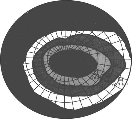 图13-15 视敏度示意图 (三)视野 单眼固定不动,正视前方一点,看到的空间范围称为单眼视野(visual field)。正常人的单眼视野鼻侧较小,颞侧较大;上部较小,下部较大。不同颜色的视野大小也不一样,白色最大,其次是黄、蓝色,再是红色,绿色最小(图13-16)。用视野仪检查患者的视野,看是否有缺损,能协助诊断视网膜、视神经和视觉传导通路的病变部位。