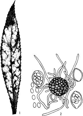 1.被害叶片 2.病原菌