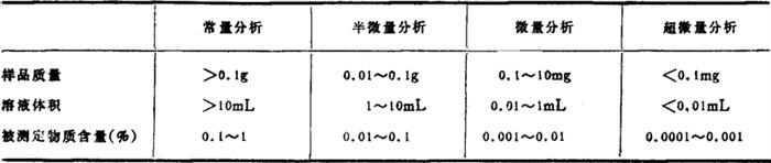 各类样品的分析,根据被分析物质含量的多少和应用的仪器与操作技术,分为常量分析、半微量分析、微量分析和超微量分析,如表7-1-1所示。