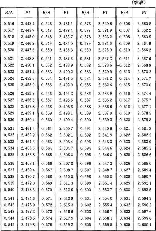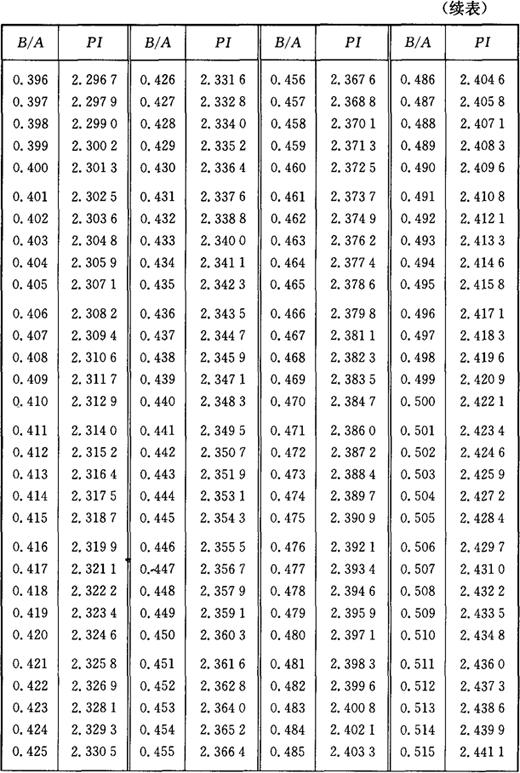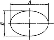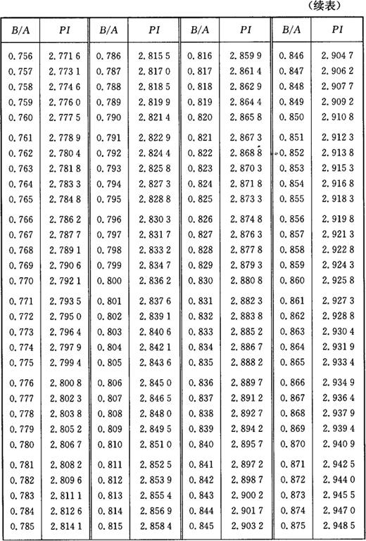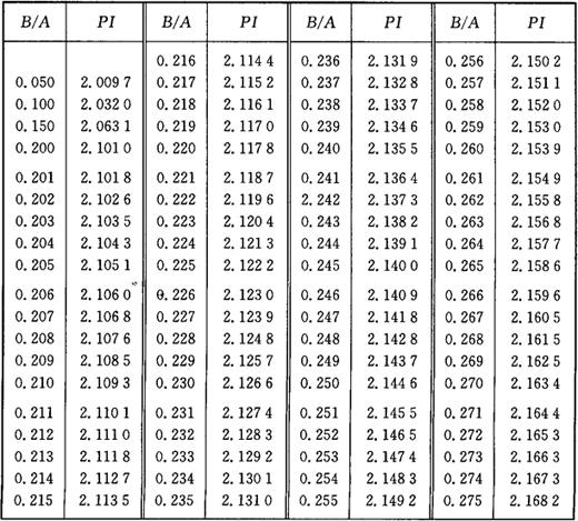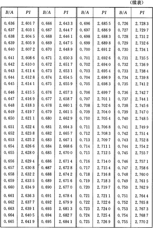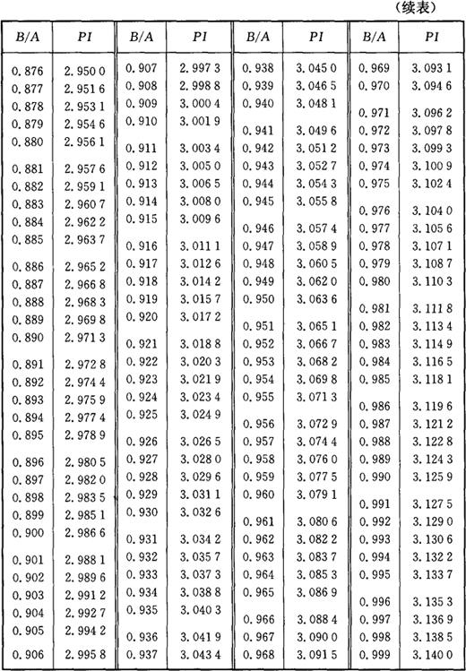 图3-2 椭圆周长计算图 椭圆(图3-2)周长的计算公式为: L=API 式中 L——椭圆周长; PI——椭圆圆周率; A——椭圆长轴; B——椭圆短轴。 PI值是由B/A的比值确定的,不同比值的椭圆周率PI,见表3-2所列。 表3-2 椭圆圆周率表