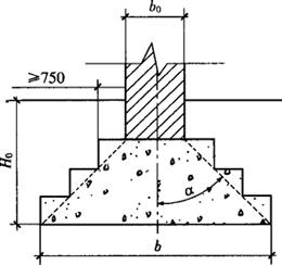 图2-42 刚性条形基础断面 图2-42中α称为刚性角,只要刚性角小于一定的数值(如一般毛石基础为27°~34°、混凝土基础为45°、灰基础为34°、碎砖三合土为30°),则设计满足刚性基础的受力要求。由此,按地基承载力算得的基底宽度,应符合下式要求,即