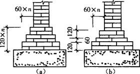 3.砌筑砖基础 在进行砌筑砖基础前,先检查一下垫层质量,合格后进行垫层面抄平,立皮数杆。在皮数杆的控制下砌筑各转角大放脚,然后以转角为标准拉线,用拉线控制两转角中间部分砌体的砌筑。当有条件时,内外砌体最好同时砌筑,否则应按有关规定留斜槎或直槎。 条形砖基础下部的扩大部分称为大放脚。大放脚分为等高式和不等高式两种,如图2-44所示。等高式大放脚是每砌筑两皮一收,两边各收进1/4砖长(60mm);不等高式大放脚是两皮一收与一皮一收相间隔,两边也各收进1/4砖长。各层大放脚的宽度应为半砖长(120mm)的整数倍。大放脚一般采用一顺一丁砌筑法,竖缝要错开,要注意十字及丁字接头处砖块的搭接,在这些交接处,纵横墙要隔皮砌通。大放脚的最下面一皮及每一收分层的最上面一皮应以丁砌为主,这样可增强砌体的整体性。