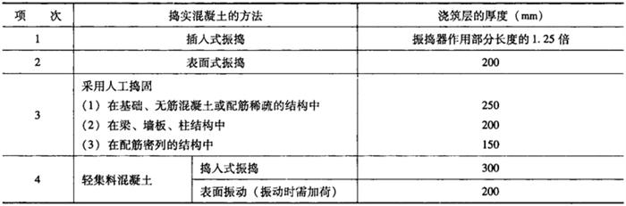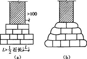 图2-45 毛石基础的断面形式 (a)阶梯形;(b)梯形 在进行毛石基础砌筑前,应先认真清理砌筑处的杂物,并夯实整平基土,弹出砌筑线和轴线。检查基槽(坑)的尺寸、标高后,按弹好的砌筑线砌第一层毛石。在适当的位置立皮数杆,皮数杆上画出分层砌石高度及退台情况,在皮数杆之间拉准线,各层石块按准线进行砌筑。 根据所放基础准线,先由技术较高工人砌墙角石块,以此固定准线作为向上砌石的标准。上级阶梯的石块应至少压砌下级阶梯的1/2,相邻阶梯的毛石应相互错缝搭砌。砌第一层石块时,基础要坐浆,石块大面向下,基础的最上一层石块,宜大面向上砌筑。基础的第一层及转角处、交接处和洞口处,宜选用较大的平毛石砌筑。 石块铺满一层,再将砂浆铺入空隙处,用小石块填空挤入砂浆,然后用手锤将小石块打紧,务必使砂浆充满空隙,填空的石块应根据空隙的大小,尽量选用整块石,不要用几块小石块来填充一个空隙,以免影响砌体强度。不允许先塞填小石块后铺砂浆,以免发生干缝和空隙。 石块应分层进行砌筑,每层厚度沟30cm为宜,或按设计规定。块石之间的上下皮竖缝必须相互错开,并力求丁顺交错排列。每砌筑一层,其表面必须大致平整,不可有尖角、驼背、放置不稳等现象,以便下一层砌筑时容易放稳,并有足够的接触面。 上、下层之间一般要求其搭接长度不小于8cm,每砌完一层后,必须校对中心线,检查和纠正偏斜现象。墙基如果需要留槎,槎口不能留在外墙转角或T字墙的结合处,且应留成踏步槎。当基础砌至最上一层时,外皮石块要求伸入墙内的长度不小于墙厚的1/2,以免因连接不好而影响砌体的整体性。 (三)混凝土和毛石混凝土基础施工 在混凝土浇筑前应进行验槽,检查基槽的土质情况、基坑尺寸、基础轴线、基底标高和密实度等是否符合设计规定。清除槽内浮土、积水、淤泥等杂物,局部处理软弱基土,安装基础模板,经检查全部合格后,才允许浇筑混凝土。 在浇筑混凝土基础时,应分层进行,使用插入式振动器捣实。当基坑深度超过2m时,应采用溜槽将混凝土送入基坑。对于阶梯形基础,每一阶高度内均应整体浇筑;对于锥形基础,应边浇筑边安装斜面部分的模板,并注意边角处混凝土的密实。独立基础应连续浇筑完毕,中间不允许出现间歇。 混凝土的配制一定要符合《普通混凝土配合比设计规程》(JGJ 55-2000)中的规定,为保证混凝土的配制质量,一般应采用机械搅拌。混凝土浇筑时的分层厚度不得超过表2-25中的数值。 表2-25 混凝土浇筑的厚度