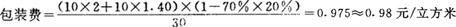 [计算例] 山铁路运输原木,每个车皮可装30m3,每个车皮需用车立柱(包装)10根,每根单价为2.00元,铁线10千克,每千克1.40元(参考价格),而原木的原价中未包括包装费。试计算每m3原木包装材料的原值、回收值和包装费。