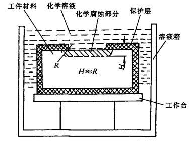| 释义 | 化学铣削 9.4.1.1 加工原理 如图9-23所示,把不要加工的部位保护起来,用腐蚀溶液去腐蚀需加工(未保护区域)区金属,即可得到预先想得到的形状.可以看出,在化学铣削过程中,其铣削(金属溶解)是“全方位”进行的.即腐蚀不仅在深度方向,也同时在侧面进行,并呈圆弧状(H≈R).