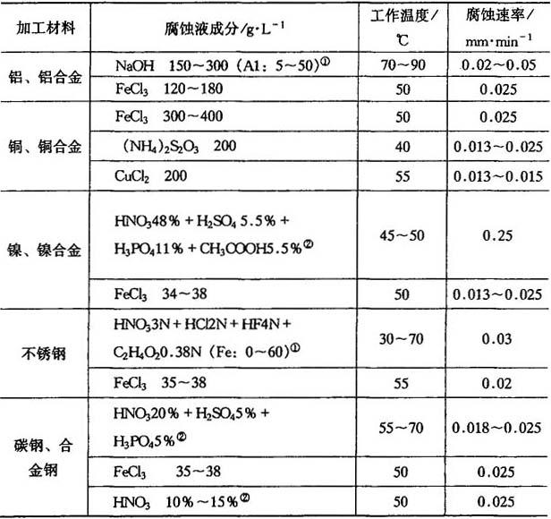 图9-24 刻型尺寸关系示意图 W2——最终腐蚀尺寸(mm). (4)活化 有些金属材料,如奥氏体不锈钢和镍基合金件,表面易生钝化薄膜,具抗蚀能力,故在化铣前要经活化处理,每次5~10min,活化液为7~12当量的盐酸液. (5)化铣 化学铣削的腐蚀剂随加工材料而有所不同,如表9-5所示.表中所列的腐蚀速率为平均值,实际上腐蚀速率的影响因素很多,如溶液浓度、温度、被加工材料的金相组织等. 化铣时,要注意大、小零件的装夹;注意溶液浓度的均匀、溶液的搅拌.取出零件后用清水冲洗. 表9-5 常用腐蚀液配方