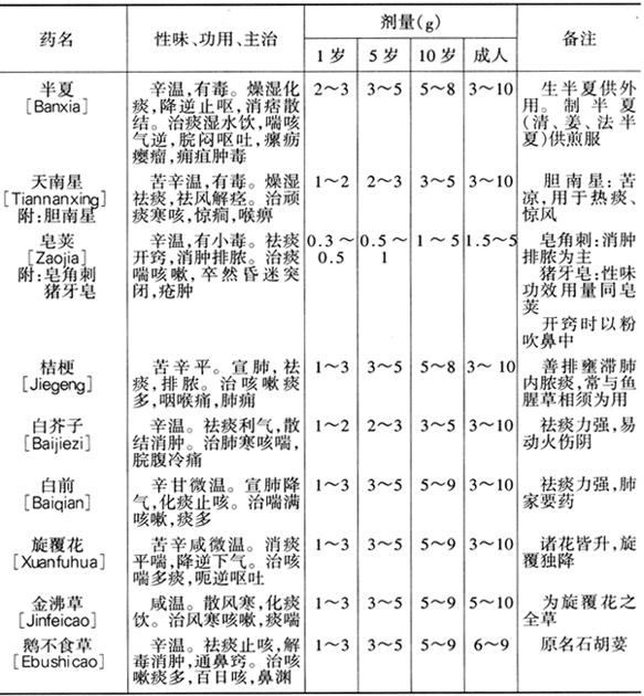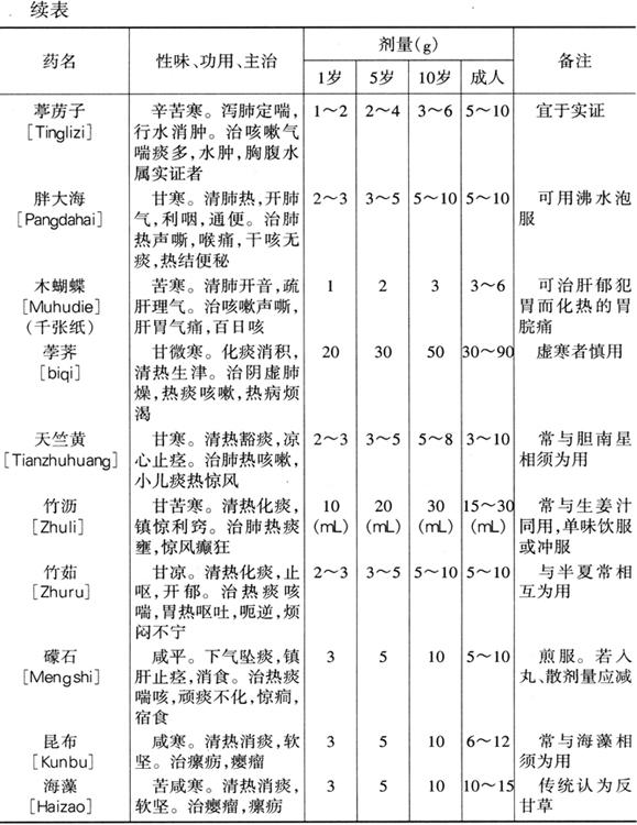 (二)清热化痰药 性味多甘寒或苦寒。甘寒清热润燥,苦寒降火。适用于热痰、燥痰咳喘以及由痰火所致的瘰疬、瘿瘤,由痰热所致的惊癎。应注意:①本类药易伤阳助湿,故脾胃虚寒、寒痰及湿痰均不宜用;②如火热偏盛者,可配清热泻火药;③如阴虚肺燥者,应配养阴润肺药。