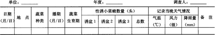 1.1.2 性诱剂诱测成虫 1.1.2.1 诱测时间 十字花科蔬菜生长季节。 1.1.2.2 诱测方法 选择当地有代表性的连片种植的十字花科蔬菜田1块。设置相互距离50m左右的诱盆3个,三角形排列,利用小菜蛾性诱剂诱芯进行诱蛾消长观察(诱芯使用时间为15天),每天记录诱蛾量填入表6-62,以掌握成虫(雄蛾)发生高峰期及其数量。并记录当晚午夜前天气情况(气温、风力和降雨)。 表6-62 小菜蛾性诱剂诱测记载表