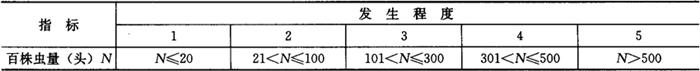 1.5 测报资料收集 十字花科蔬菜种类和主要品种及其栽培面积;播种期和各期播种的面积;当地气象台(站)主要气象要素的预测值和实测值。 2 预测预报方法 2.1 发生期预测 根据灯诱和性诱成虫结果,统计小菜蛾成虫始盛期、高峰期、盛末期,结合将要预报的下一代发生期间当地的气温预报,及该条件下的各虫态发育历期,即可推测出下一代的发生期。 2.2 发生程度预测 根据田间虫情调查、蔬菜品种布局及栽培生长情况,结合气象资料,参考历史资料和发生程度分级指标进行综合分析,做出发生程度预测。 3 发生程度分级指标 发生程度分为5级,以幼虫发生高峰期的百株虫量表示,各级划分指标见表6-66。 表6-66 小菜蛾发生程度分级指标