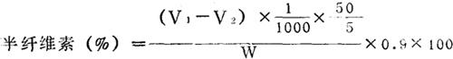 式中:V1:滴定斐林试剂A、B液各5毫升,空白试液5毫升所用标准葡萄糖液总毫升数; V2:滴定斐林试剂A、B液各5毫升,样品液5毫 升所用葡萄糖总毫升数; 50 W:样品重量(克); 0.9:已糖换算为半纤维素的系数; 100:换算为百分含量。 |