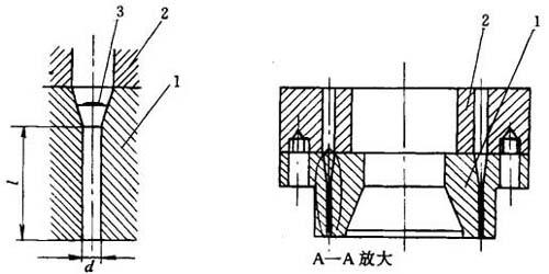 图11-6 直角式单丝机头结构示意图 1-温度计插入孔 2-过滤板 3-模体 4-连接法兰 5-分流器 6-喷丝板 7-锁紧螺丝 机头流道直径应逐渐缩小,产生压力将塑料压实,一般取D/d=(2~4)/1。分流器扩张角一般为30°~80°,分流器处流道的截面积应大于喷丝孔截面积之和。 主流道未设置了一个“瘦颈”,对物料形成了一定的阻力,然后,将物料均匀地输送到喷丝板。设置瘦颈的优点是:喷丝板各处物料压力均匀,流量稳定,减少机头内存料及物料分解的可能,也减少清理机头的废料。 3.喷丝板 喷丝板是机头的主要部件,其结构如图11-7所示。