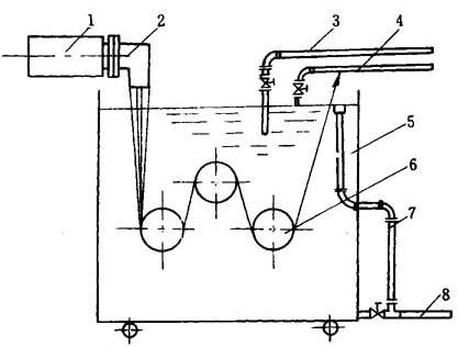 对于同一原料,拉伸比固定,孔径增大时单丝的直径也增大。增大喷丝孔直径虽可提高产量,若孔径太大则拉伸比也要随之增大,卷取速度也要相当快,以致无法进行操作。喷丝孔的孔数为12~60孔;对于不需要分丝的单丝,其孔数可增加到100以上。喷丝孔的直径常用为0.8mm、0.9mm、1.0mm(有时孔径能达2.3mm)。喷丝孔需要精密准确地加工,各孔的孔径、各孔的中心距。孔的平直部分的长度均要相等,否则在喷丝过程中易产生断丝或丝的粗细不均。喷丝孔的长径比为(4~10)∶1。不同塑料品种有不同的孔径包角,PE取60°为好,PP取20°为好。 4.冷却水箱 从喷丝孔出来的单丝温度很高,例如,PE可达300℃,为了防止单丝相互粘接,必须迅速冷却定型。冷却水箱中水面应保持一定的高度,喷丝板到冷却水表面的距离为15~50mm为好,由具体树脂确定;距离过大,塑料氧化会降低单丝的强度。水箱的结构见图11-8。