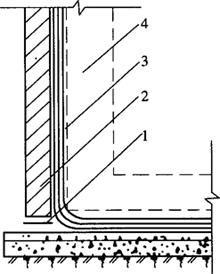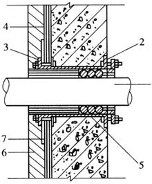 图8-14 外防内贴法卷材防水构造 1-平铺油毡层;2-砖保护层;3-油毡防水层;4-待施工的地下构筑物 (1)在已施工好的混凝土垫层上砌筑永久保护墙,保护墙全部砌筑完毕后,用1∶3的水泥砂浆在垫层和永久保护墙上抹找平层。保护墙与垫层之间须干铺一层油毡。 (2)找平层干燥后即涂刷冷底子油或基层处理剂,干燥后方可铺贴卷材防水层,铺贴时应先铺立面、后铺平面,先铺转角,后铺大面。在全部转角处应铺贴卷材附加层,附加层可两层同类油毡,或一层抗拉强度较高的卷材,并确实粘贴紧密。 (3)卷材防水层铺完经验收合格后,即应做好保护层。立面可抹水泥砂浆、贴塑料板,或用氯丁系胶粘剂粘铺石油沥青纸胎油毡;平面可抹水泥砂浆,或浇筑不少于50mm厚的细石混凝土。 (4)施工所需的防水结构,将防水层确实压紧。如防水层为混凝土结构,则永久保护墙可作为一侧模板,结构顶板卷材防水层上的细石混凝土保护层厚度不应小于70mm;如防水层为单层卷材,则其与保护层之间应设置隔离层。 (5)结构完工经验收合格后,方可回填土。 (三)特殊部位的防水处理 1.管道埋设件防水处理 管道埋设件与卷材防水层连接处的做法,如图8-15所示。为了避免因结构沉降造成管道变形破坏,应在管道穿过结构处埋设套管,套管上附有法兰盘,套管应在浇筑结构时准确预埋于设计位置。卷材防水层应粘贴在套管的法兰盘上,粘贴的宽度至少为100mm,并用夹板将卷材压紧。粘贴前应将法兰盘及夹板上的尘垢和铁锈清除干净,刷上一层沥青。夹紧卷材的夹板下面,应用软金属片、石棉纸板、防水卷材等衬垫。
