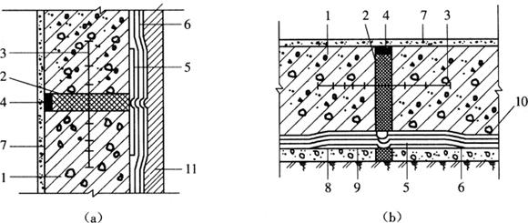 图8-16 变形缝处的防水做法 (a)墙体变形缝;(b)底板变形缝 1-需防水结构;2-浸过沥青的木丝板;3-止水带;4-填缝油膏;5-卷材附加层;6-卷材防水层;7-水泥砂浆面层;8-混凝土垫层;9-水泥砂浆找平层;10-水泥砂浆保护层;11-保护墙 |