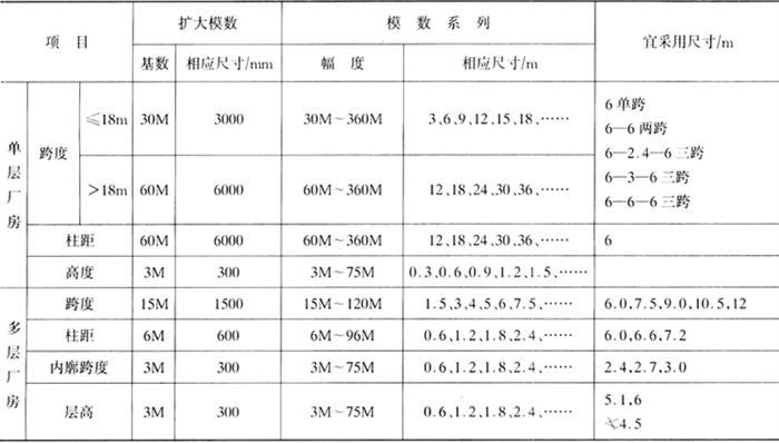 表4-3-8 厂房跨度、柱距、高度的模数数列