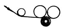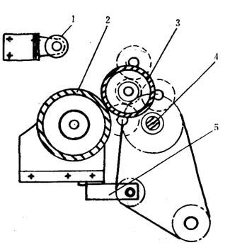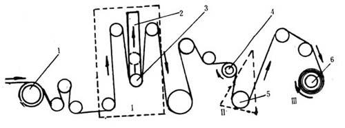 图6-1-23 表面卷取示意图 一般四辊压延机均采用自动切割、卷取、换轴的装置,如图6-1-24所示。采用这种装置时,薄膜由传送辊1到卷取部分Ⅲ的中间设有张力调整装置。在不设张力调整装置时,如卷轴6的转速不变,则薄膜所受张力就会随着料卷直径增大而线速度增大.致使薄膜卷取不当,但当设有调整装置时,浮辊3就会上升从而通过电位器装置2来调节6之驱动电动机的转速,以保持恒定的张力,使薄膜卷取时松紧一致和平整。保持张力的大小应随压延制品的要求而异。