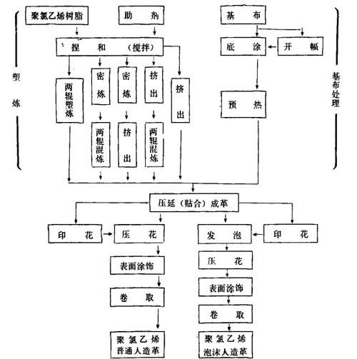| 释义 | 压延法 压延法是指利用压延机成型人造革的方法。压延法生产聚氯乙烯人造革主要有两种方法,一是直接贴合法,即在压延成型时,直接利用压延机将物料擦到或贴合到引入基布上,制成聚氯乙烯人造革的方法;二是分步层合法,即先成型压延薄膜,然后再与基布贴合。本节介绍直接贴合法。 压延法可用于生产人造革和壁纸,且有发泡和不发泡两种。基材可用市布、帆布、针织布、玻璃布、不织布和纸。本节主要介绍布基人造革。 压延法人造革的优点是:①可以使用廉价的聚氯乙烯悬浮树脂;②加工速度快,一般为30m/min,高者可达50m/min;③物料与织物的复合较容易。缺点是投资较大。 (一)设备 1.压延机 生产聚氯乙烯人造革使用的压延机主要是三辊压延机和四辊压延机,详见第六章。 2.发泡烘箱 制造发泡压延人造革时,一般使用分段式烘箱。烘箱实例如下: 用途:衣料用压延人造革 使用发泡剂:偶氮二甲酰胺 三段烘箱总长:18m 烘箱温度控制: 第一段:190~200℃ 第二段:180~190℃ 第三段:170~180℃ 通过烘箱速度:18~22m/min(由发泡层厚度决定) (二)工艺 1.工艺流程 压延法生产聚氯乙烯人造革的工艺流程见图8-1-23。